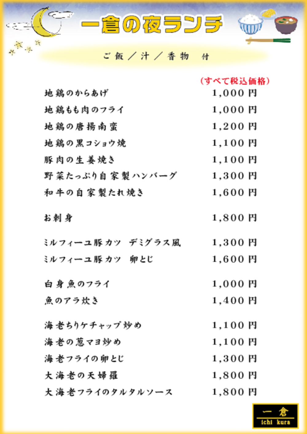 おうちで一倉!お持ち帰り「Take Out」テイクアウトはじめました!! ランチメニューや一倉の夜ランチ、おしながきからお選び下さい。 ぜひ、チェックしてお電話ください。お問い合わせは、0896-58-3297まで。