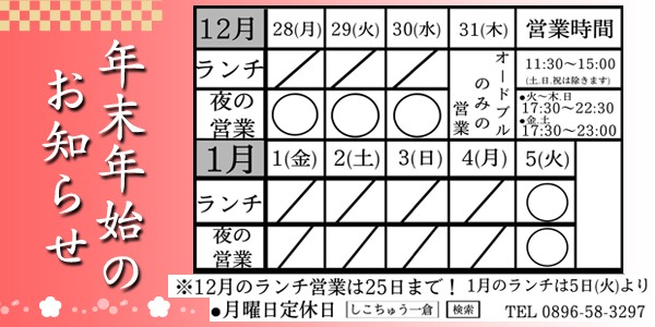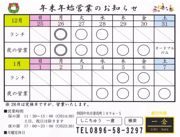 年末年始営業のお知らせ 26(月)は定休日ですが、営業します!