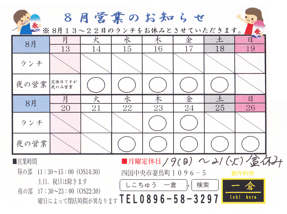 2019お盆 営業時間のお知らせ