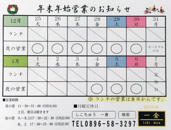 ※12月のランチ営業は25日まで!1月のランチは5日(火)より