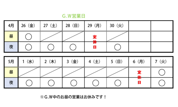 ゴールデンウィーク中のお昼の営業は、お休みです!